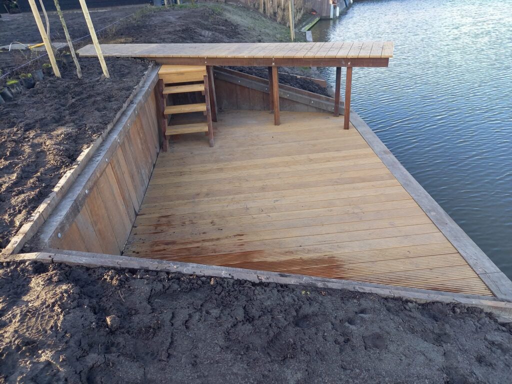 Voor deze klant realiseerden we een sfeervolle houten vlonder aan het water, inclusief stevige fundering. Ideaal om van het uitzicht te genieten en direct aan het water te kunnen zitten.